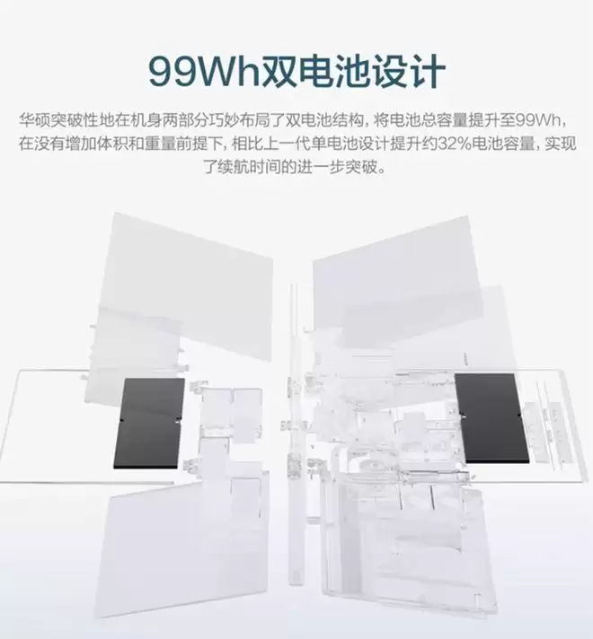 华硕灵耀14 双屏 2026还创新性地采用了双电池结构,电池容量提升至99Wh,实现续航时间的进一步突破。配备100W迷你电源适配器,充电更快,携带方便。