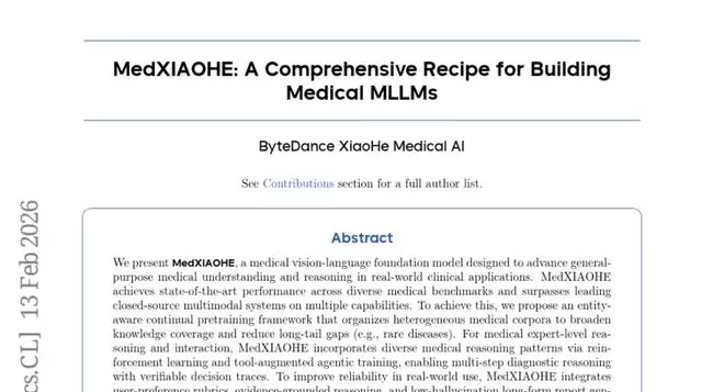 ByteDance XiaoHe医疗AI团队在2026年2月发表了一项突破性研究,详细介绍了他们开发的MedXIAOHE医疗视觉语言基础模型。这项研究发表在arXiv预印本平台,论文编号为arXiv:2602.12705v1,感兴趣的读者可以通过这个编号查询完整论文。