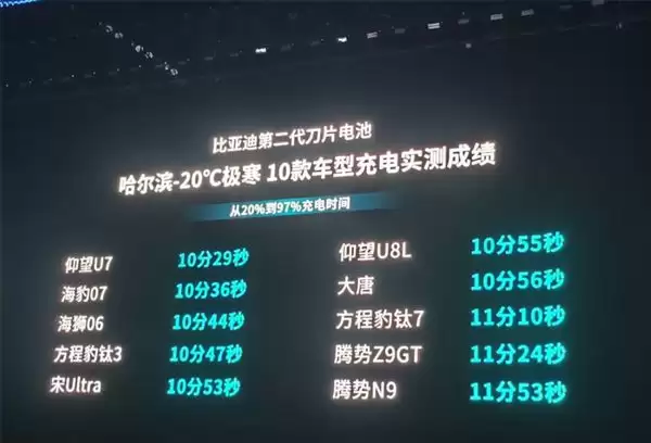 在哈尔滨-20℃的极寒充电实测中,二代刀片电池,从20%充到97%,全程只需12分钟。并且,这还不是高端车型专属的技术,包括仰望U7、海豹07、海狮06、腾势N9等比亚迪从100万以上到10万级全价格段车型覆盖在内,充电最快仅10分29秒。