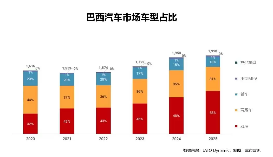 要理解当下的市场格局,必须先回顾过去五年巴西消费者行为的转变。自2024年起,巴西汽车市场开启了一轮被称为“SUV化”的结构性重塑——SUV车型从小众选择迅速崛起为市场主导力量。2024年,SUV注册量首次超越轿车等传统车身类型,成为市场的转折点。到2025年,这一占比已攀升至55%,标志着市场格局的根本性改变。