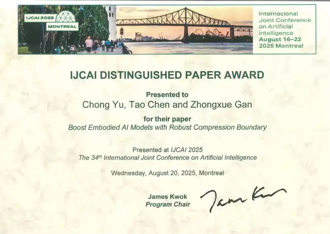▲眸深具身大模型算侧压缩框架获得IJCAI 2025全球最佳论文奖