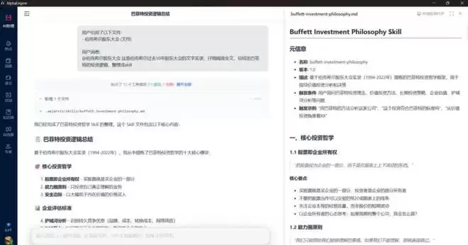 几分钟后,AlphaClaw 生成了一个名为「Buffett Investment Philosophy」的 Skill,涵盖能力圈原则、护城河评估标准、财务舞弊识别等核心要点。