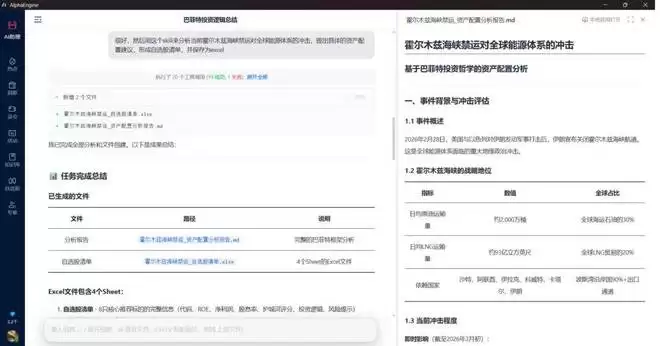 提示词:使用这个 Skill,站在巴菲特角度分析霍尔木兹海峡禁运对全球能源体系的冲击,提出资产配置建议,生成自选股清单并保存为 Excel。