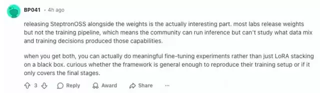有网友评价:“与权重一同发布Steptron OSS才是真正有趣的部分。大多数实验室都会发布权重,但却不会公开训练流程。当你同时拥有这两种工具时,你实际上就能够进行有意义的微调实验,而不再只是将LoRA堆叠在一个黑盒上。”