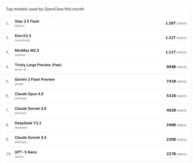 在最新的OpenClaw模型调用量榜单上,中国开源模型稳占过半席位,其中阶跃星辰新旗舰模型Step 3.5 Flash,凭借“更快、更强、更稳”的核心优势,连续一周稳居单日调用榜首。根据OpenRouter最新数据,过去30天内,Step 3.5 Flash在OpenClaw上的tokens调用总量已位居全球第一,超越Kimi K2.5、MiniMax M2.5,成为OpenRouter上小龙虾的「Top1 模型」,获得全球小龙虾用户的认可。