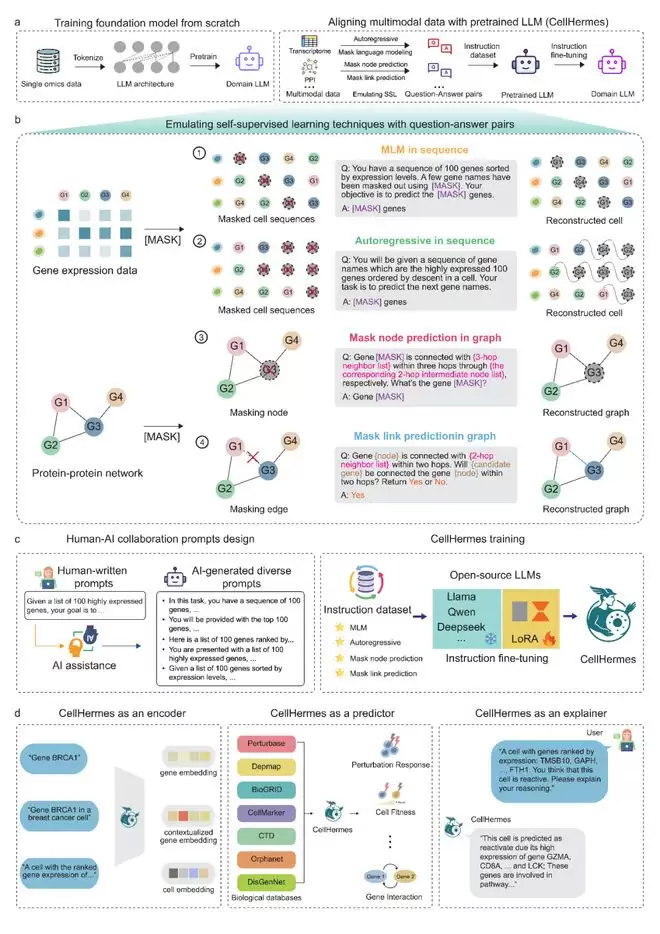 在此基础上,研究团队设计了多种自监督学习任务,包括掩码语言建模(预测句子中被遮盖的基因)、自回归预测(续写表达句子),以及图结构中的节点和边预测,使模型在预训练过程中同时获取和融合两类数据中的知识。