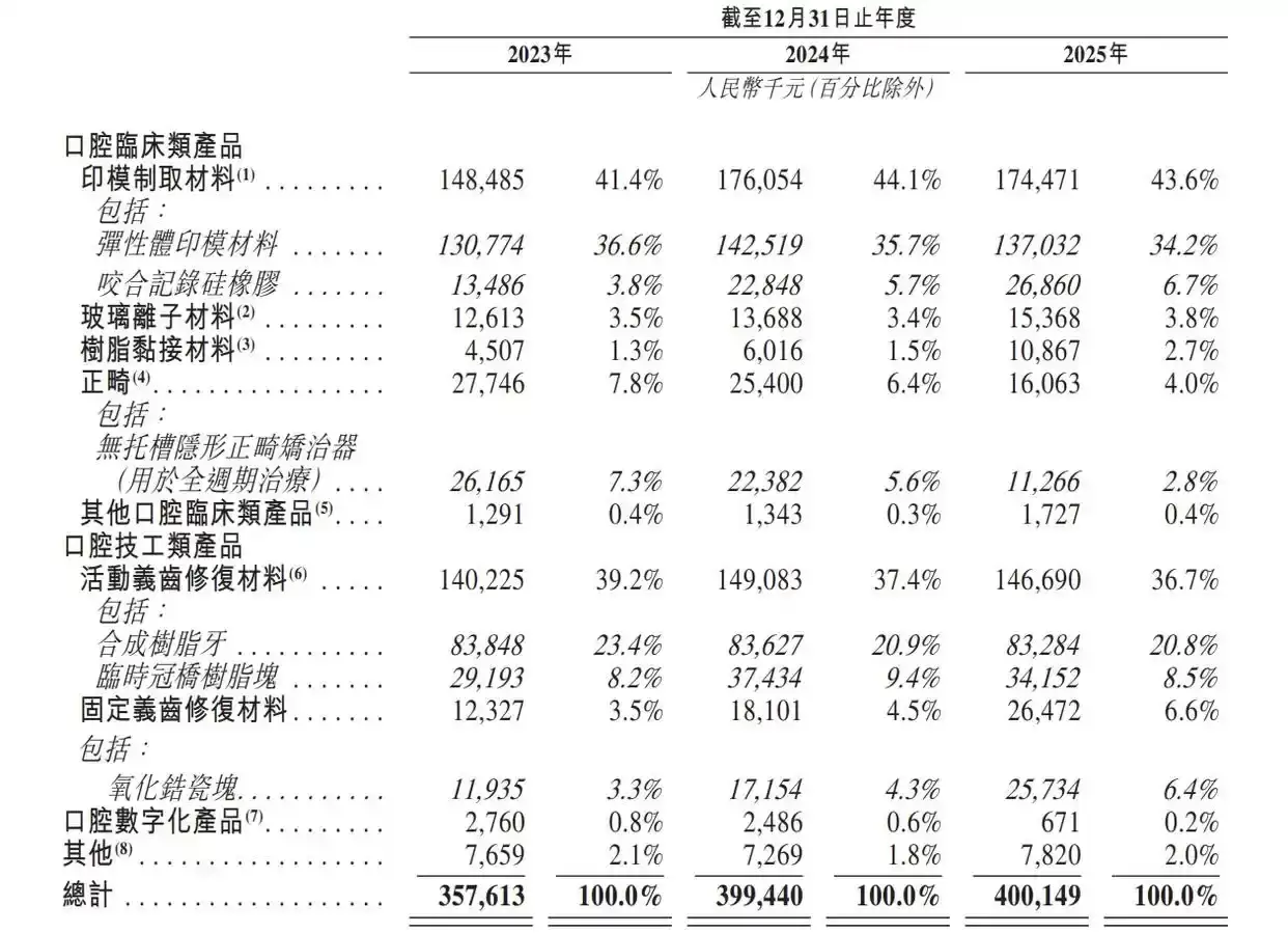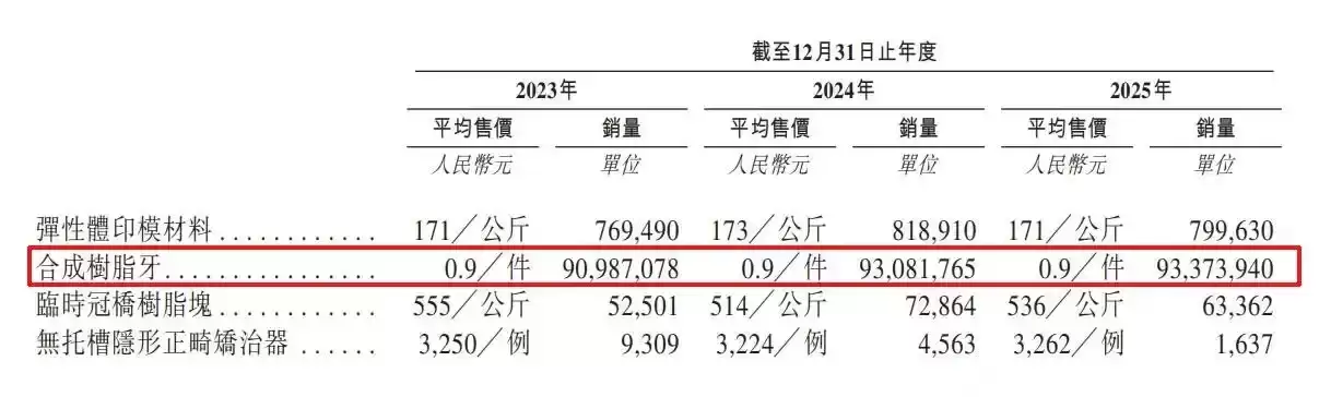 此外,合成树脂牙以及临时冠桥树脂块的合计收入占比在三成以上。合成树脂牙是一种假牙产品,而临时冠桥树脂块是补牙时常用的材料,2024年至2025年,两者合计营收体量均保持在亿元级别。