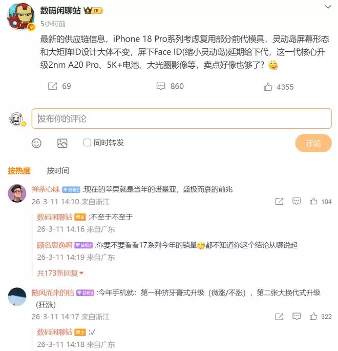 果粉们可以先把那口气咽回去了!之前传得沸沸扬扬的iPhone18 Pro缩小灵动岛,现在有最新爆料说得很直白,那就是iPhone考虑复用部分前代模具,屏下Face ID延期给下代。这意味着你今年9月
