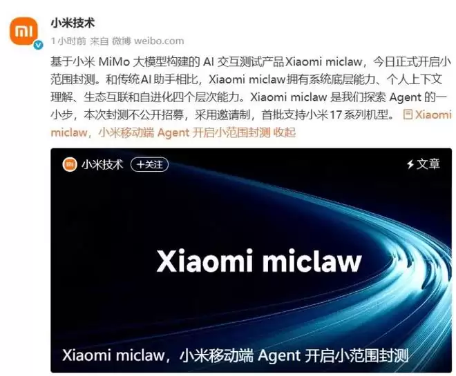 近日,小米正式官宣,自研AI智能体MiclawAgent已进入内测阶段,目标直指上车落地,要让小米汽车拥有更个性化、更主动的智能交互能力。