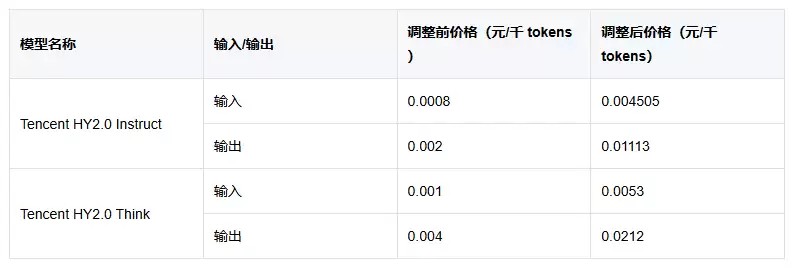 Tencent HY2.0 Think的输入价格从0.001元调整为0.0053元,输出价格从0.004元调整为0.0212元。套餐订阅用户可通过套餐抵扣部分费用。