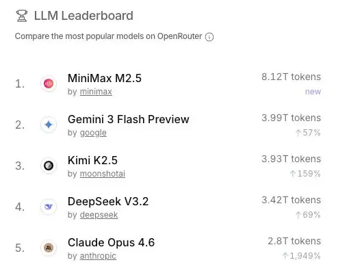 也就导致 OpenRouter 上的模型调用数据,前五个里住进了三个雷打不动的国产模型:MiniMax M2.5,Kimi K2.5 和 DeepSeek V3.2,虽偶尔起伏,但始终在榜。