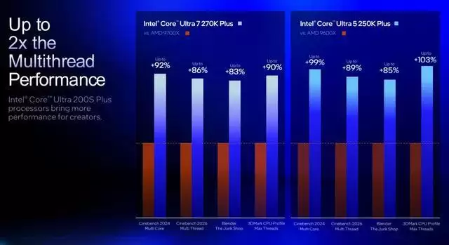 面向更低价位市场的 Core Ultra 7 250K Plus 则被定价为 200 美元。英特尔宣称,相比于同价位段的 AMD Ryzen 5 9600X,这款处理器在多核性能方面的平均提升可达 103%,意味着在多核负载环境中有望实现接近翻倍的性能优势。在当下游戏玩家与内容创作者群体高度重叠的背景下,这种“多核性能加倍”的宣传显然在为其预算平台提高吸引力。