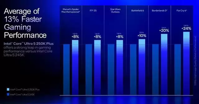 然而,在最关键的“游戏性能对比”方面,英特尔的最新资料却变得相对含糊。英特尔在对外展示中没有给出 270K Plus 与 250K Plus 相比上一代旗舰 i9-14900K 或 Core Ultra 9 285K 的详细游戏帧率对比,也没有直接与 AMD 最新一代高端游戏处理器进行正面对照。相反,公司选择主要将两款新产品与其直接前代 265K 与 245K 进行对比,用增幅百分比来展示代际升级幅度。