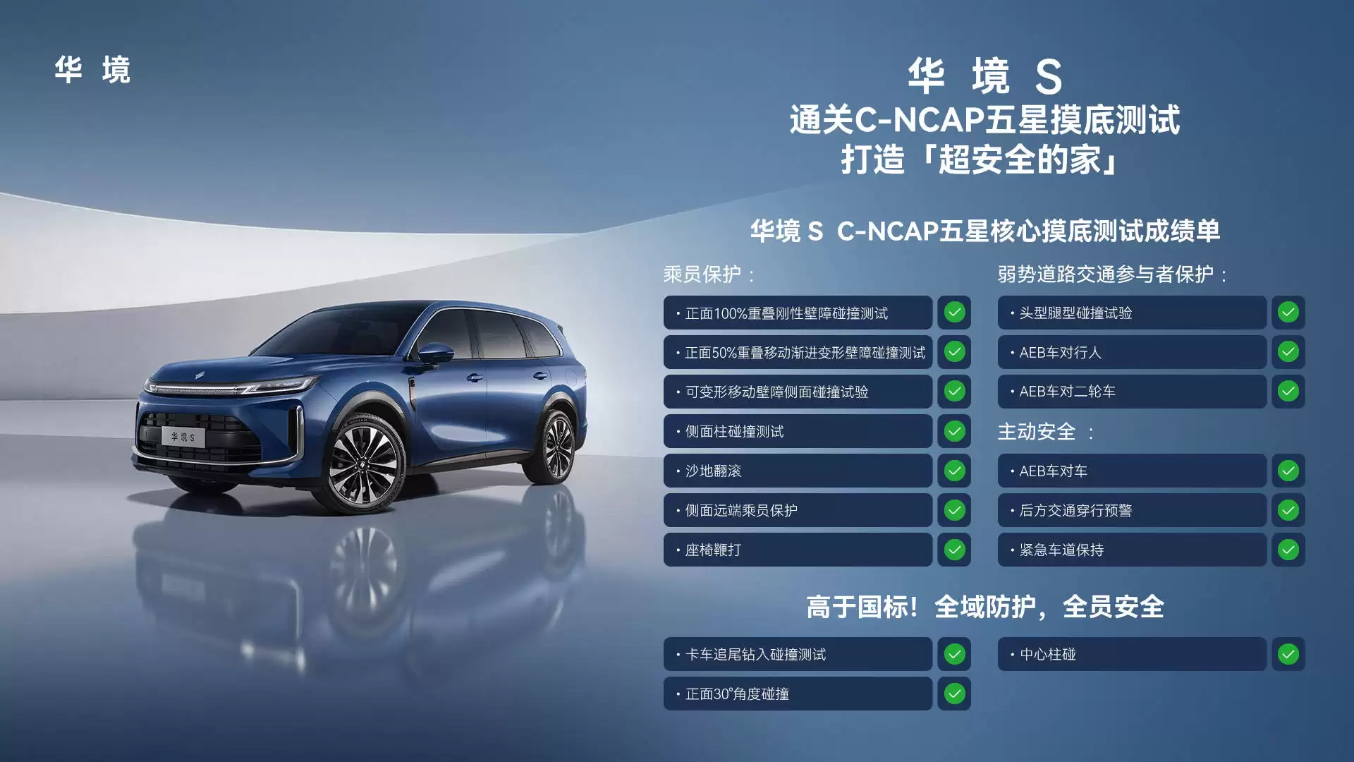 测试数据显示,华境S在C-NCAP标准测试基础上,额外增加了中心柱碰、卡车钻入碰撞、正侧30°偏置碰撞等严苛工况验证,全面提升了复杂事故场景下的生存空间保障能力。其车身吸能区采用铝合金与高强度钢组合,历经上千次仿真优化,可高效化解冲击能量;整车扭转刚度显著提升,确保多角度碰撞中乘员舱结构完整。从主动避险到高效防护,再到事故后的快速救援响应,华境S以全场景安全能力,重新诠释了家用车的安全价值。