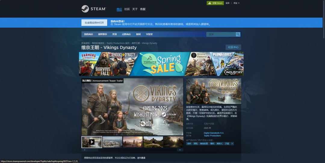 《维京王朝》是由Digital Daredevils S.A.开发的一款沙盒冒险游戏,其官方购买渠道正是Steam平台。只要访问这款游戏的商店页面,你就能全面了解它的所有相关信息。