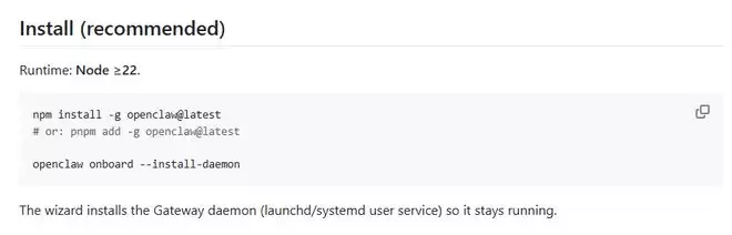OpenClaw项目最新安装指南显示。图片来源:OpenClaw的Github