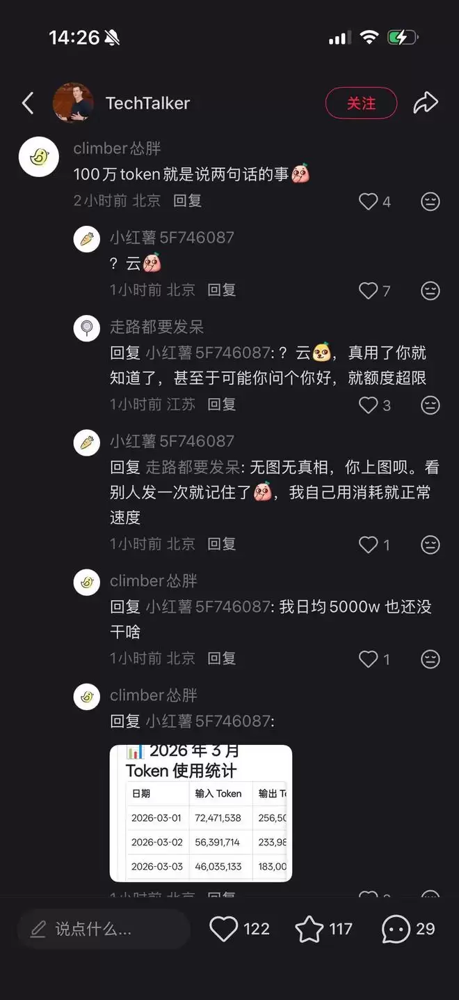 龙虾的token消耗量在互联网上扑朔迷离。图片来源:小红书