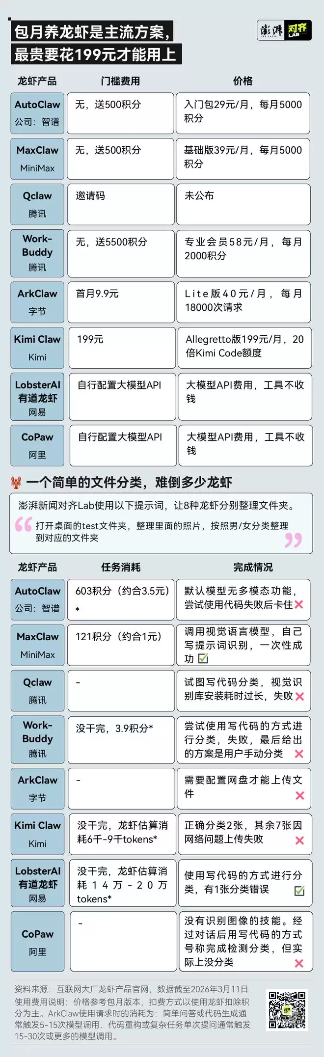 普通人养一只“龙虾”要花多少钱?以澎湃新闻对齐Lab测评的8种“龙虾”来看,付费方式主要分为门槛费用和使用费用两个方面。门槛费用主要是一次性激活“龙虾”服务的费用。使用价格最常见是包月或包年积分制,按照每月可使用的积分额度来规定“龙虾”可以干多少任务。