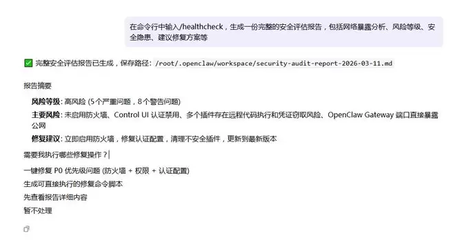 龙虾自检结果显示,存在端口直接暴露公网风险。图片来源:ArkClaw