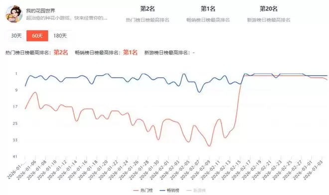 二是品效协同。春节期间,《我的花园世界》在抖音小游戏端表现突出,2月16日登顶畅销榜榜首,随后坐稳TOP2位置。而热门榜排名则是从 2月13日开始飙升。