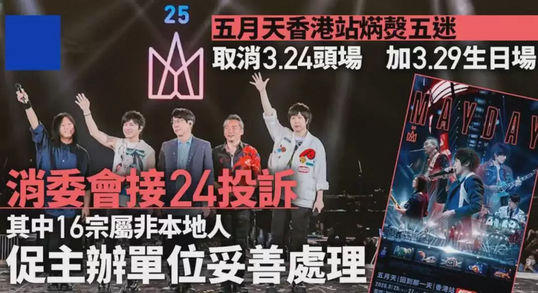 早些时候,五月天原定于三月二十四日在香港举办的演唱会被突然取消,主办方给出的理由是“确保演出质量”。然而没过多久,乐队却又在香港新增了一场“成团纪念日”演唱会。这一来一去,不仅引发外界猜测,更关键的是,关于演唱会的退票安排、已购票歌迷的机票酒店等损失补偿方案迟迟未妥善跟进,让不少专门请了假、甚至自掏腰包预订了行程的歌迷蒙受不少损失,一场巨大的争议就此爆发。对此,歌迷们纷纷采取投诉方式维权,香港消委会、海关及五月天方面都先后出面予以回应。
