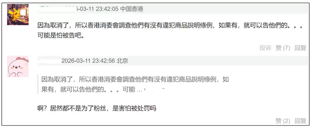 那么,此次退票事件引发的舆论风波究竟有多猛?有身在香港的网友现身说法,表示已经收到消委会通知,将调查主办方是否违反《商品说明条例》,若查实违规便会采取法律行动。这番表态间接透露了一个信息——主办方之所以愿意提供免费彩排场作为补偿,恐怕正是担心面临处罚。