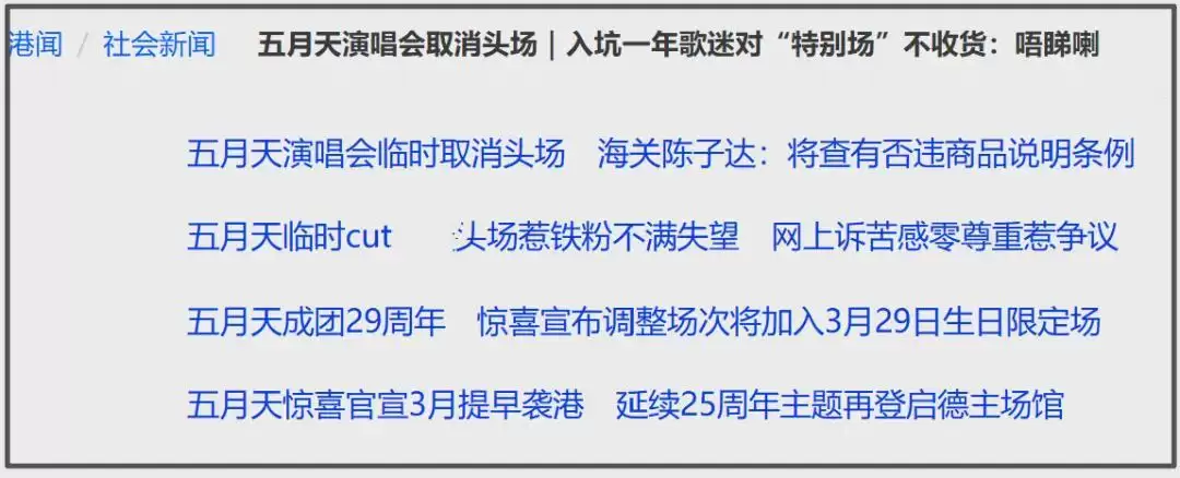距离消费者权益保护日到来没几天了,五月天退票风波直接登上香港各大媒体头条。“退票重开”、“铁粉网上诉苦”、“海关调查”、“歌迷不满”等话题热度持续攀升,事件性质从娱乐新闻演变为社会新闻。