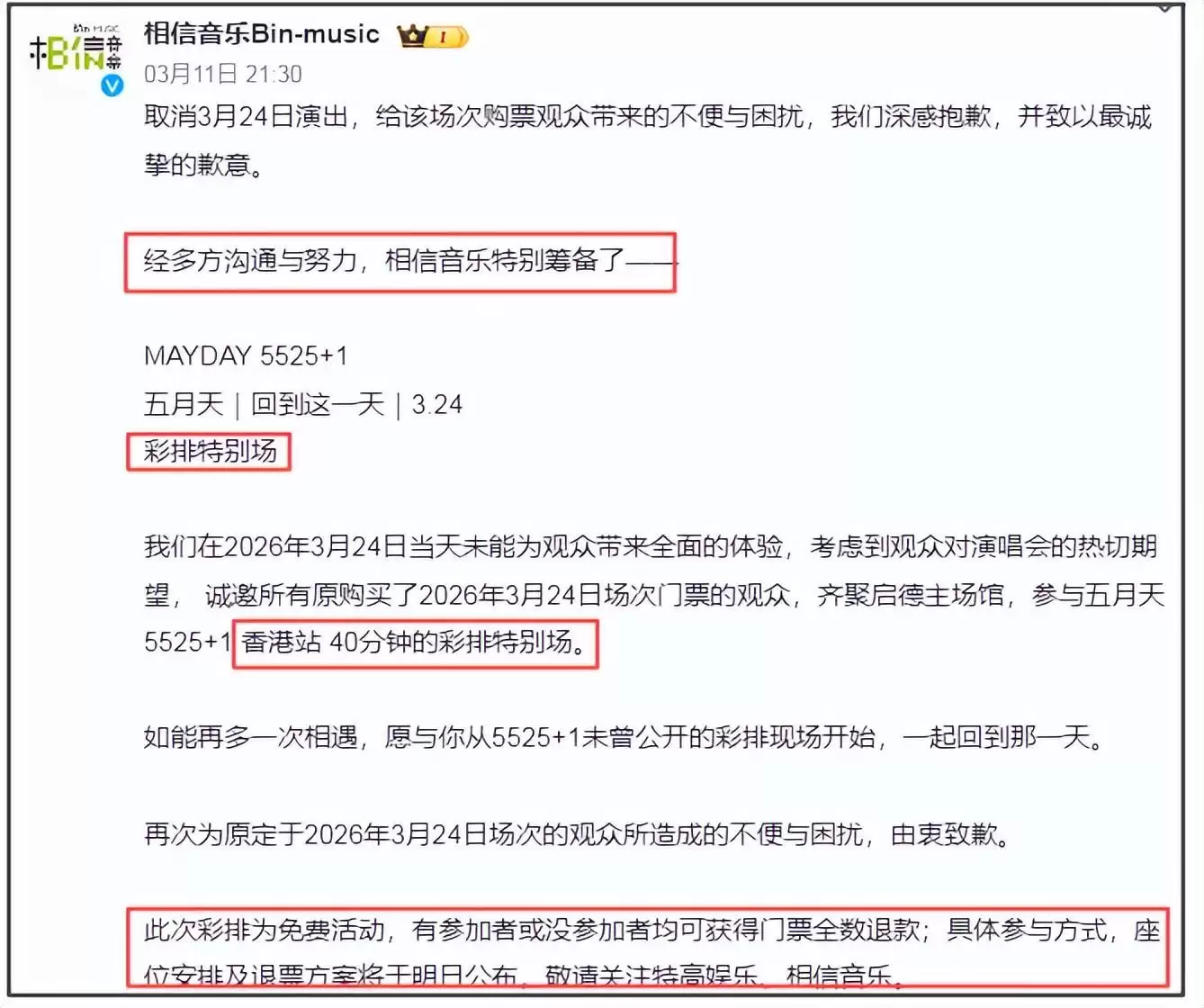 先来看看五月天经纪公司的正式回应。相信音乐通过官方社交媒体发文,对需要退票的歌迷表示歉意,并称经过多方沟通与努力,已筹备了一场“四十分钟的免费彩排特别场”,具体安排在原定演唱会日期即三月二十四日。声明中强调,无论歌迷是否参加这场彩排,均可获得票款全额退款,详细方案将稍后公开。