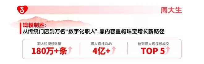 而客单价较高的周大生,把导购变成“数字化职人”,用180万条短视频持续种草,在高客单决策链路中反复建立信任,再用门店网络承接转化,让珠宝从低频刚需转向可持续的内容驱动增长。