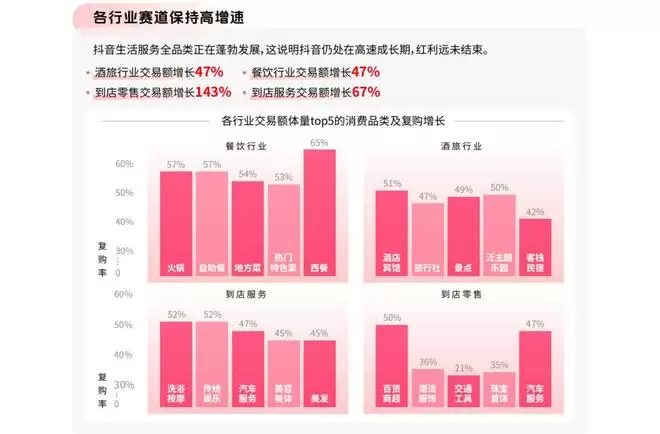 而细分到具体赛道,也纷纷呈现出高速增长态势。2025年抖音生活服务酒旅交易额增长47%,餐饮增长47%,到店零售增长143%,到店服务增长67%。
