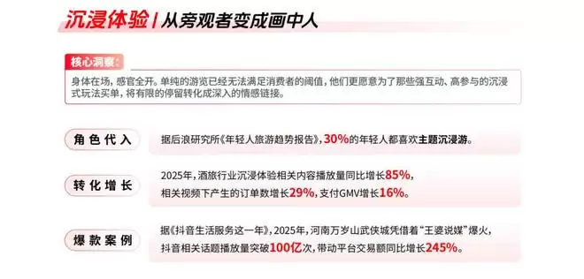 报告中提到,“参与感”相关内容的播放、搜索与互动显著增长。用户开始为“我能在这趟旅行中体验什么”买单,而不仅仅是“我能看到什么”。这种转变也让酒旅消费从一次性服务,逐渐向情绪记忆和重复体验延伸。