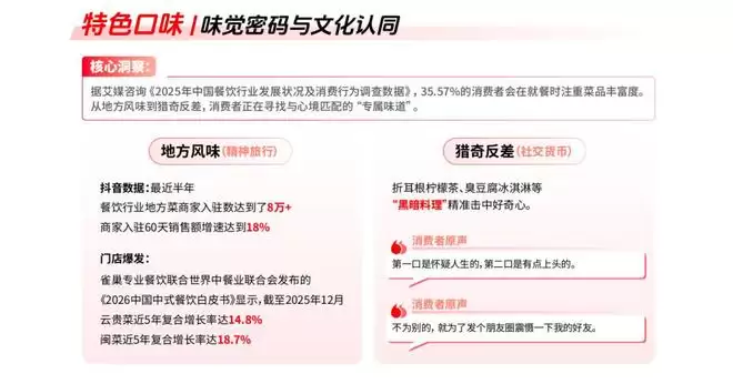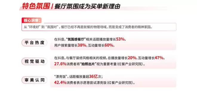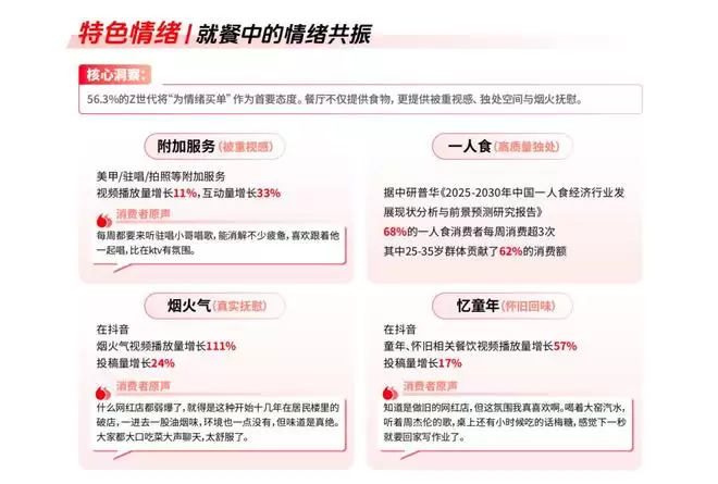 报告中关于餐饮的拆解显示,特色氛围、特色情绪和特色口味正在形成合力。一方面,“氛围感餐厅”“漂亮饭”等内容在平台上的热度持续攀升;另一方面,一人食、烟火气、怀旧风味等看似分散的偏好,其实都指向同一个底层需求:在吃饭这件高频日常中,重新找到情绪的落点。