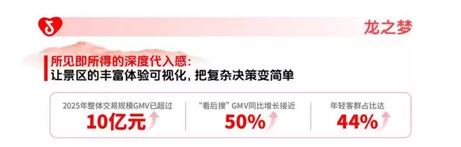 其破局路径,是用内容降低认知门槛,用直播降低决策成本。通过“饲养员给大象洗澡”“带薪撸虎”等高反差内容制造传播爆点,叠加节点策划,半个月实现GMV约5000万。2025年整体交易规模突破10亿元,“看后搜”GMV同比增长近50%。同时,直播间被打造为“在线导游”,高频讲解票种与组合逻辑,解决用户“怎么买最划算”的具体问题。线上数据再反哺产品升级,打造演艺城板块,年轻客群占比提升至44%。