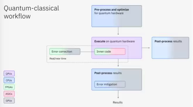 IBM则采取了更为激进的商业化策略。IBM提出了"以量子为中心的超级计算机"概念,将量子处理器、CPU和GPU整合到同一个计算结构中。用QPU解决负责处理那些需要指数级经典内存才能模拟的量子线路。
