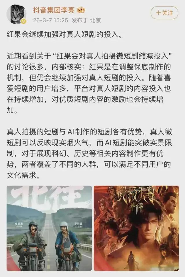 面对汹涌的舆情,抖音集团副总裁李亮很快出面进行了澄清与否认,指出"红果会继续加强对真人短剧的投入",优质短剧内容的激励也将持续。