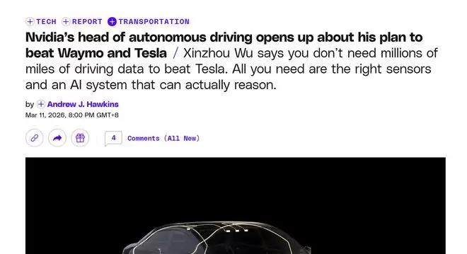 【环球网科技综合报道】3月12日消息,据The Verge报道,英伟达首席执行官黄仁勋近日亲身体验了公司参与开发的辅助驾驶系统Alpamayo,乘坐搭载该系统相关技术的奔驰轿车完成道路测试,全程未出现人工接管情况,展现出英伟达在自动驾驶领域的技术积累与研发成果。