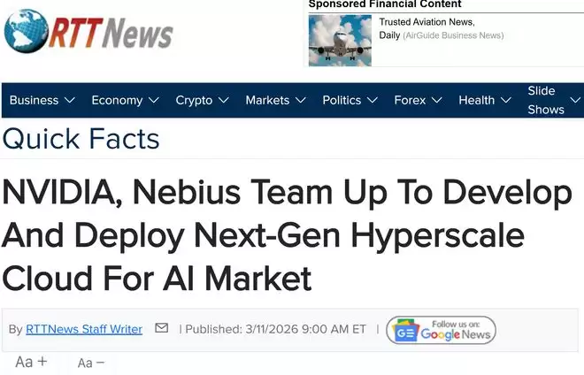 【环球网科技综合报道】3月12日消息,据RTTNews报道,英伟达与Nebius集团近日宣布达成深度战略合作,双方将联手开发并部署面向人工智能市场的新一代超大规模云计算服务,精准对接AI原生企业及各类机构的发展需求,共同助力全球人工智能产业高质量发展。