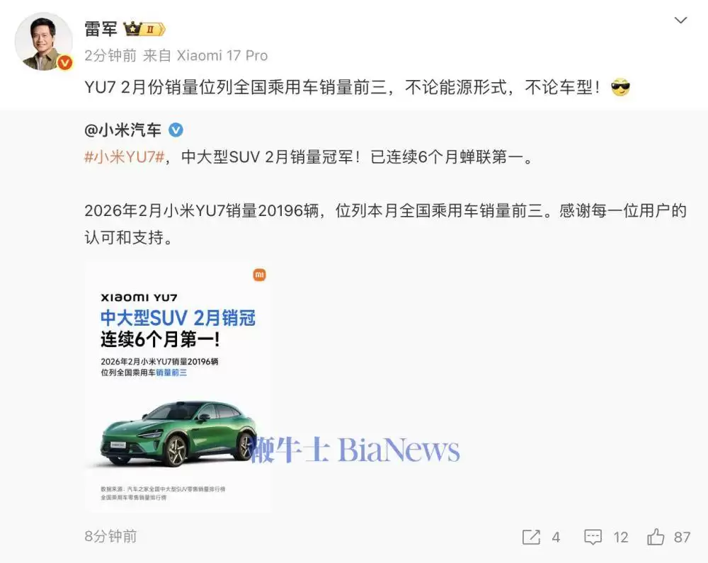 小米YU7蝉联中型SUV销冠,2月跻身全国乘用车前三
