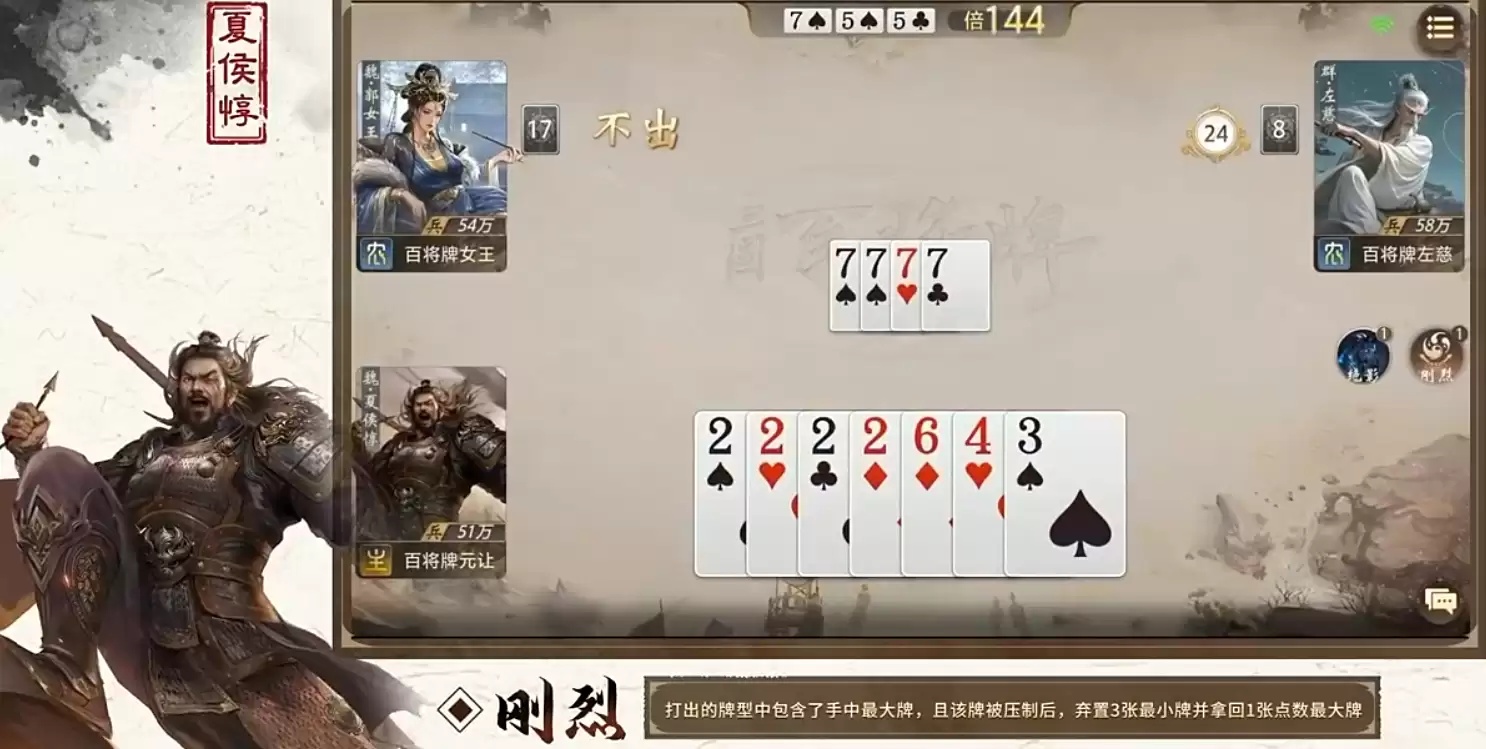 夏侯惇的核心技能【刚烈】:打出包含最大牌的牌型被压制后,可弃置3张最小牌并拿回1张最大牌。优先用大牌诱敌、回收王牌持续威慑。手牌≤3张时发动技能可弃置剩余手牌直接获胜。队友需在其手牌少时故意压制助其触发技能;敌手则用复杂牌型逼其提前消耗技能。