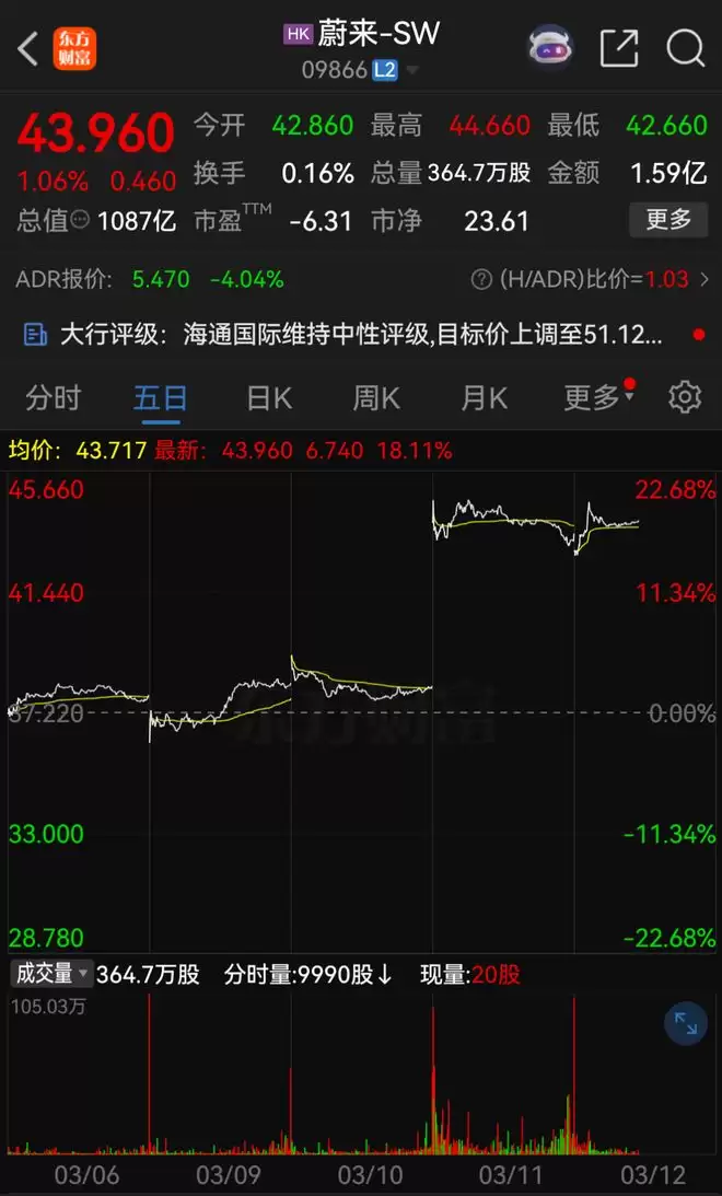 3月11日,蔚来在港股一度涨超17%,总市值重新迈过1000亿港元大关。截至3月12日上午收盘,蔚来港股股价报43.92港元/股,总市值达1087亿港元。