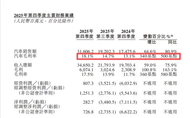 受益于高端纯电市场的发展,蔚来2025年第四季度的汽车毛利率达18.1%,同比上升5个百分点,环比上升3.4个百分点。