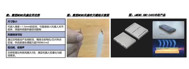 优必选的关节结构专利:通过关节模组结构简化、设置中空结构、在壳体外壁安装散热装置(如散热风扇)进行风冷。MEMS微型风扇:厚度可嵌入<1.5mm空间,可贴装到芯片和电机驱动器等热点位置,以压电驱动产生微射流定点冷却;报告提到其热流密度处理能力可超100 W/cm²。