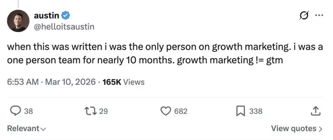 Austin Lau 在 LinkedIn 上最近补充了一些背景。他指出,那篇被广泛传播的文章描述的是 2025 年第二季度他作为唯一增长营销人员的经历,距今已经快 8 个月了。团队后来确实扩充了人手,尽管规模仍然比外界想象的小得多,用他的话说,“我们的战斗力远超我们的人数”。