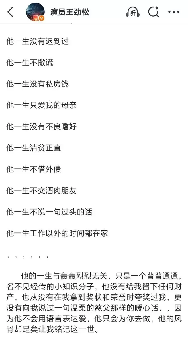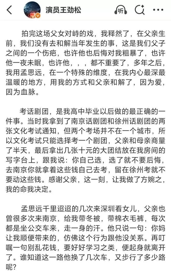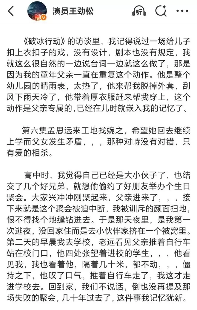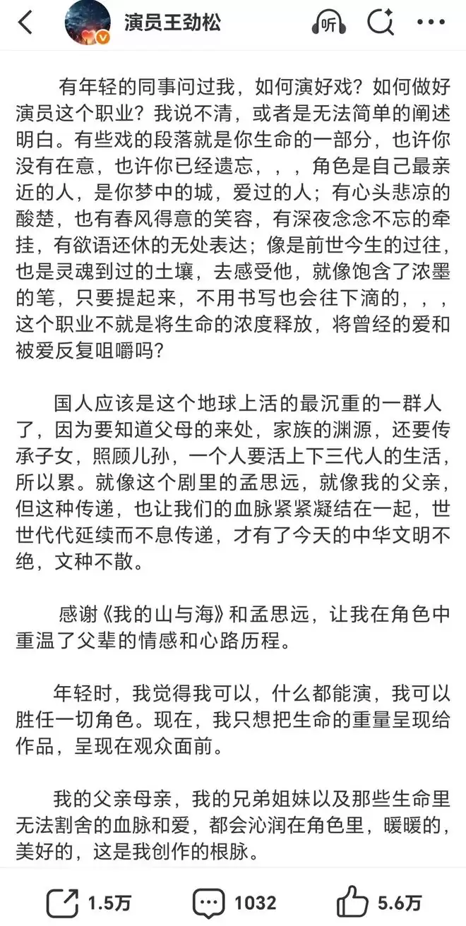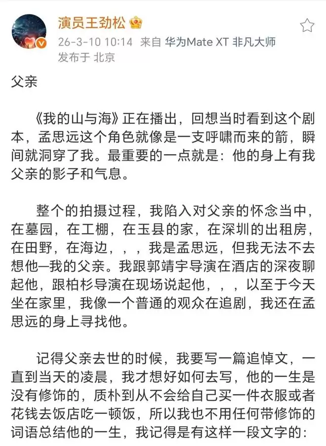 《我的山与海》开播后,王劲松在个人社交平台,发长文讲述了他跟父亲的故事,以及对孟思远这个角色的理解。