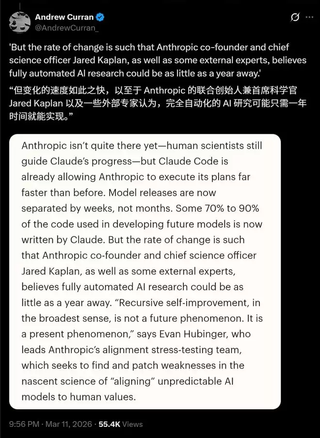AI变化的速度如此之快,以至于Anthropic联创兼首席科学官Jared Kaplan以及一些外部专家认为,完全自动化的AI研究,可能只需一年时间就能实现!