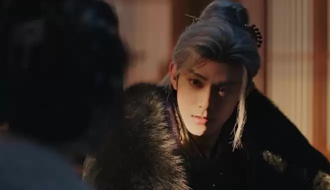 剧中他的银发造型堪称神来之笔,三色发丝拼接精致又独特,搭配深色锦袍与毛领裘衣,苍白的肤色与阴郁的眼神交织,破碎感与压迫感拉满。