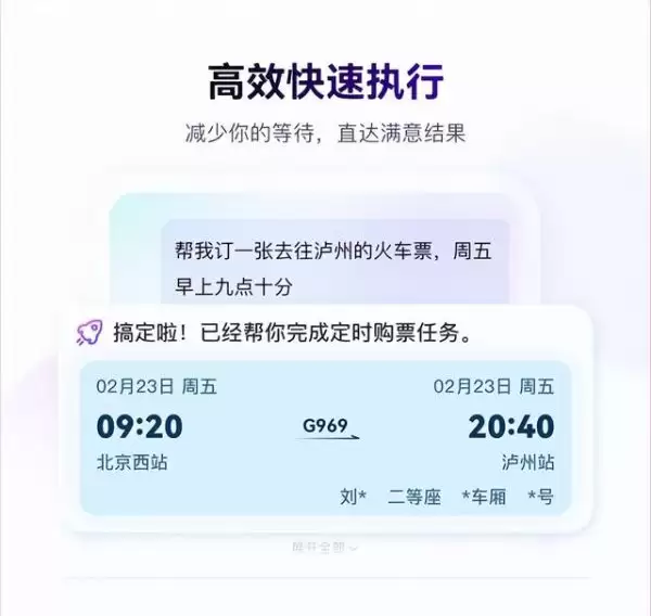 例如,用户只需输入“帮我搜索2月18日北京到长沙价格最低的机票”,系统即可在云端自动完成搜索与下单流程,等待用户最终确认即可。