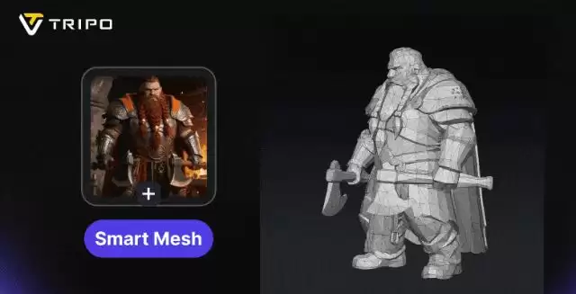 在这个案例中,Smart Mesh 完美复刻了角色头盔的圆润弧度与护甲的硬朗切面,尾巴等细长结构无粘连,几何形变控制极其稳健: