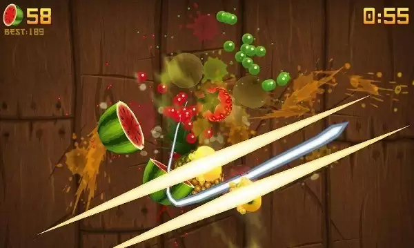 会不断出现水果,时间为一分半。在这一分半内谁因连击而切出的分数越高,谁就是胜利者。游戏不会因水果的掉落而失败。