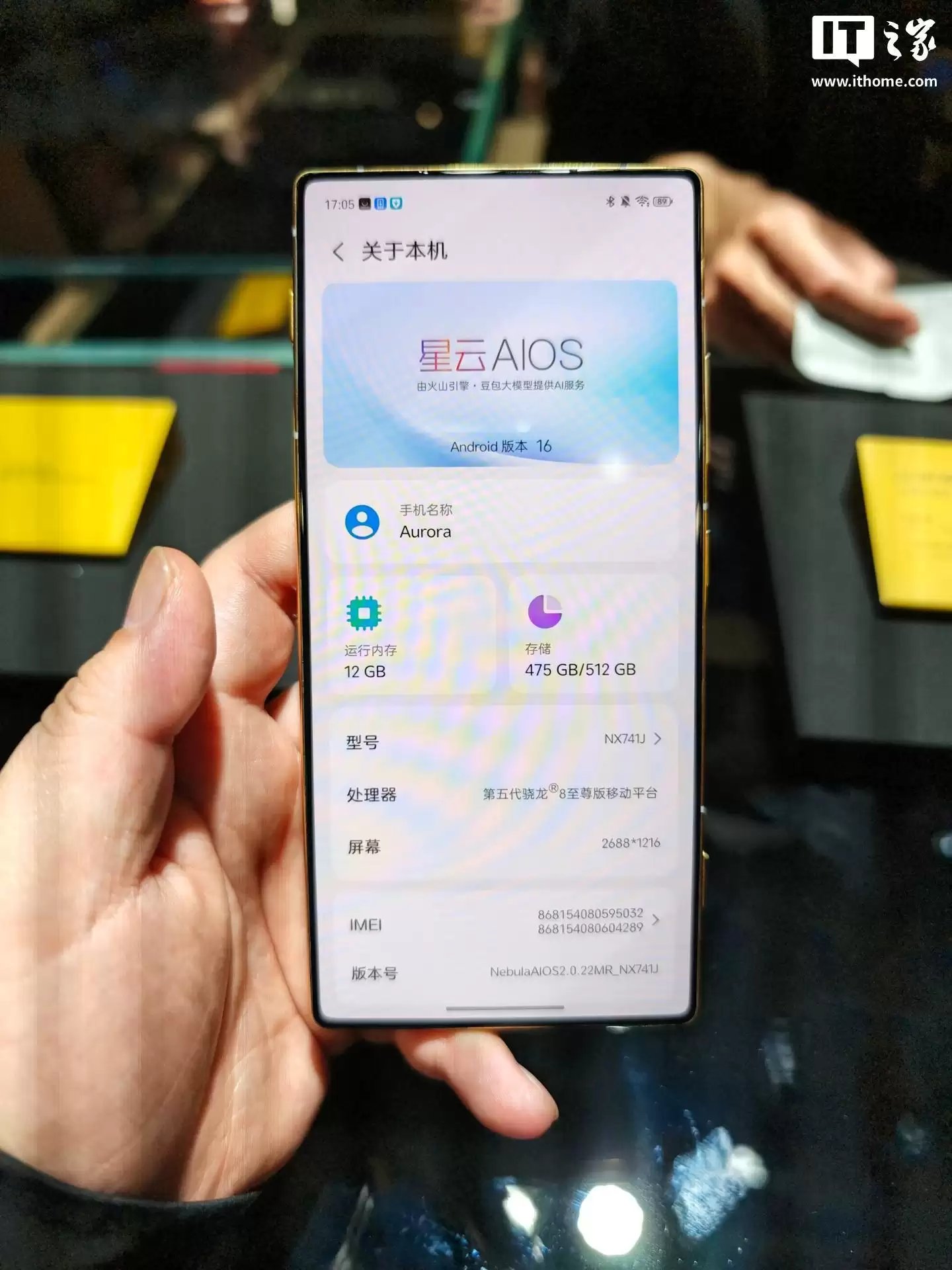 IT之家在现场体验了这款追觅旗舰手机,该机正面配备一块无挖孔全面屏。系统设置页面显示,其型号为NX741J,搭载第五代骁龙8至尊版移动平台,并预装基于Android 16的星云AIOS系统。